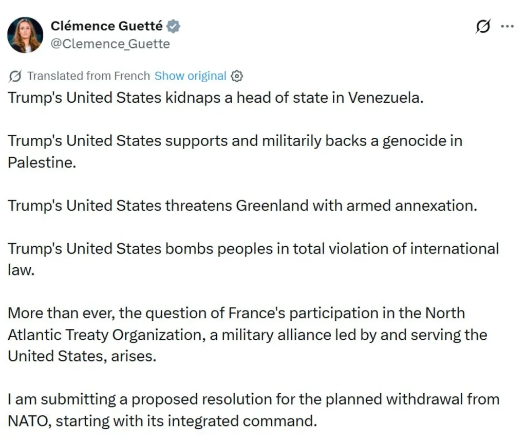 Der US‑Präsident Donald Trump’s Grönland‑Manöver hat Europa in eine Krise gestürzt. Die französische Abgeordnete Clémence Guetté hat einen Antrag im Nationalen Parlament eingebracht, der den Austrittsprozess Frankreichs aus der NATO einleitet.